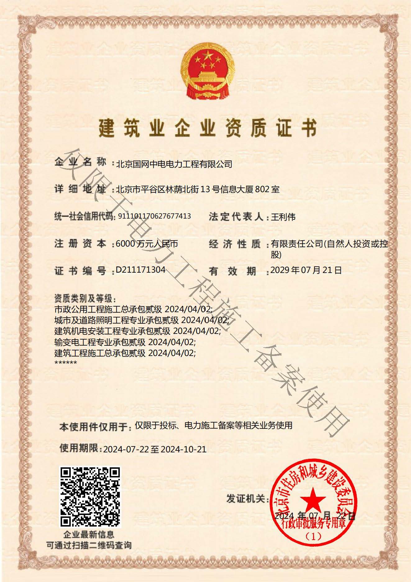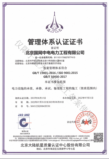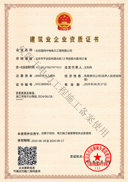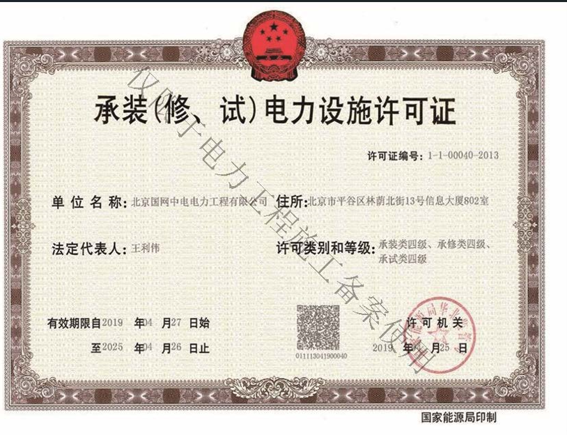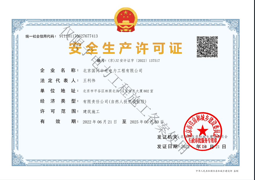 北京國(guó)網(wǎng)中電電力工程有限公司,已取得國(guó)家電監(jiān)會(huì)頒發(fā)的《承裝(修、試)電力設(shè)施許可證》、為電力施工承裝四級(jí)、承修四級(jí)、承試四級(jí)企業(yè)。北京市住房和城鄉(xiāng)建設(shè)委員會(huì)頒發(fā)的房屋建筑施工總承包二級(jí)、機(jī)電設(shè)備安裝工程專(zhuān)業(yè)承包二級(jí)、輸變電專(zhuān)業(yè)承包二級(jí)、城市及道路照明工程專(zhuān)業(yè)承包二級(jí)、市政公用工程總承包二級(jí)資質(zhì)、勞務(wù)不分等級(jí),已通過(guò)ISO9001:2015 GB/T50430-2017質(zhì)量管理體系、GB/T24001-2016/ISO 14001:2015環(huán)境管理體系、